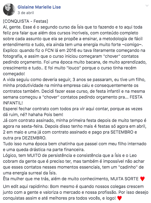 Sou fotógrafa lifestyle de famílias e festas infantis há mais de 10 anos e fundadora do Coisa de Fotógrafa.Ao longo desse tempo, já auxiliei mais de 14 mil fotógrafos a viverem bem, e somente, de fotografia, com o Fotografia Como Negócio.E aqui nesse aulão você vai encontrar tudo o que precisa pra aprender o jeito certo de fotografar eventos infantis.